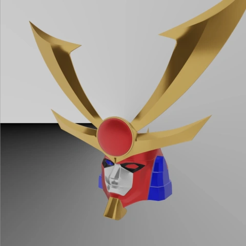 Futuristic helmet with red, blue, and white colors and prominent golden horns.