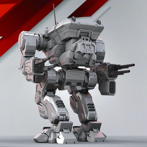 A detailed 3D model of a mech robot with bulky armor and weaponry, designed for 3D printing.