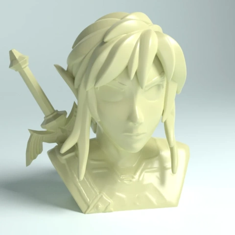 Bust of a stylized character with an elf-like appearance and sword, inspired by a video game hero.