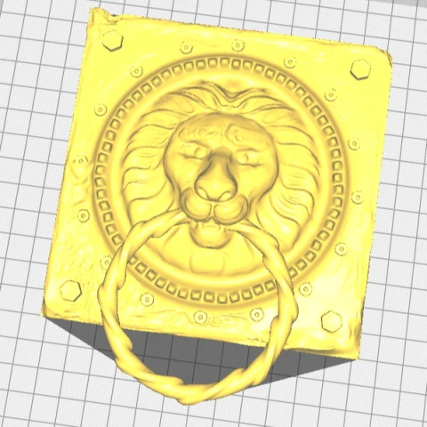 A 3D model of a lion-themed door knocker with a circular ring on a textured square plate.