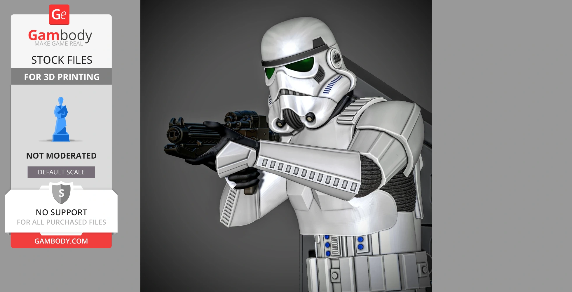 Clone Trooper in armor, holding a blaster rifle, detailed 3D model for printing.