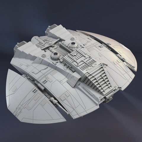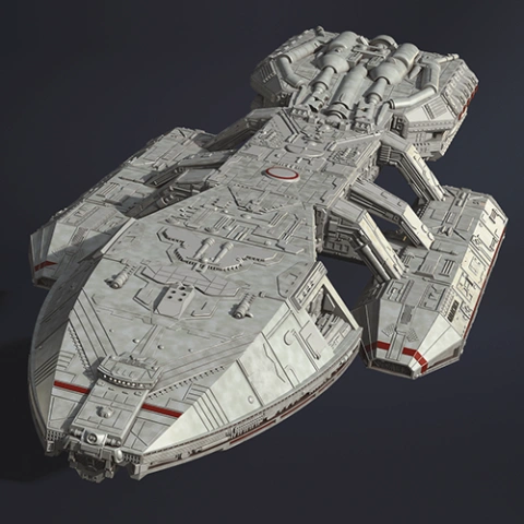 Detailed 3D model of a Battlestar Galactica shuttle with intricate surface features.