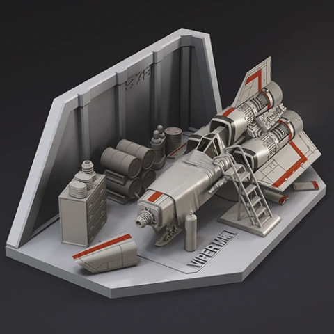 A detailed 3D model of a spacecraft in a hangar with barrels and equipment, labeled 'Viper MKII.'