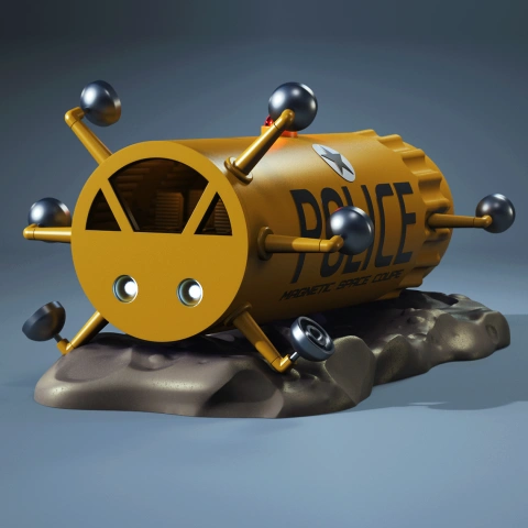 Retro-style yellow space coupe with 'POLICE' text, antennas, on a rocky base.