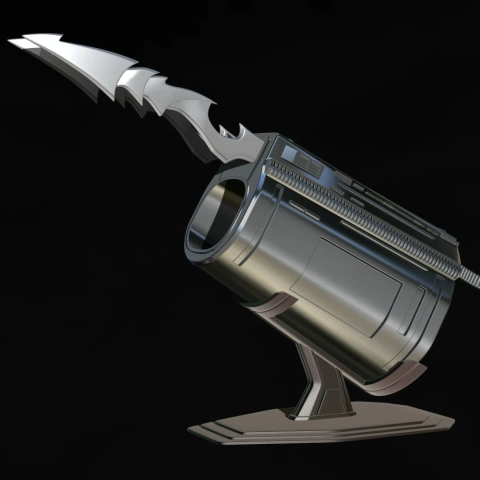 Futuristic forearm gauntlet with a sharp, jagged blade and cylindrical structure on a stand.