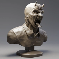 Bust of a screaming, horned figure with an open mouth, wearing a collared shirt on a stand.