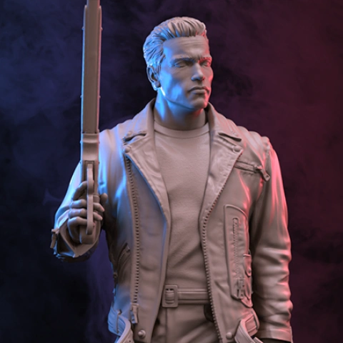 3D model of a muscular figure in a leather jacket holding a long firearm, inspired by a famous movie character.