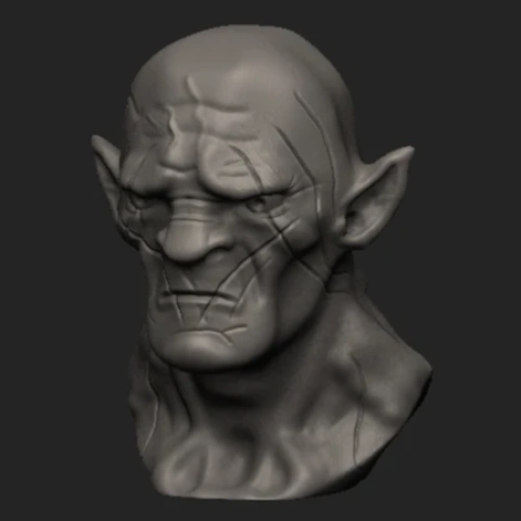3D model of a stern, scarred orc's head with pointed ears, from a fantasy setting.
